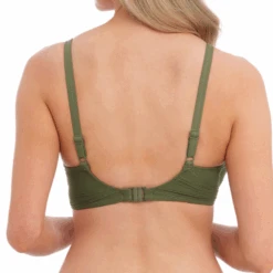 Das Full Cup Bikini Oberteil aus der Beach Waves Kollektion ist in der Farbe Olive erhältlich. Die Cups dieses Full CupTop sind nicht vorgeformt. Die Körbchen sind mit Bügeln versehen, die einen festen Halt geben. Im unteren Bereich der Körbchen ist der Stoff in Falten gelegt, was den Bikini schlank wirken lässt.