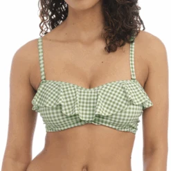 Das Check In Bandeau Bikinitop von Freya Bademode hat einen eleganten Khaki Print. Dieses Bikinitop hat einen Wasserfallrand, der für einen verspielten Touch sorgt! Das Top kann auf verschiedene Arten getragen werden, nämlich trägerlos, gerade und als Neckholder Modell.