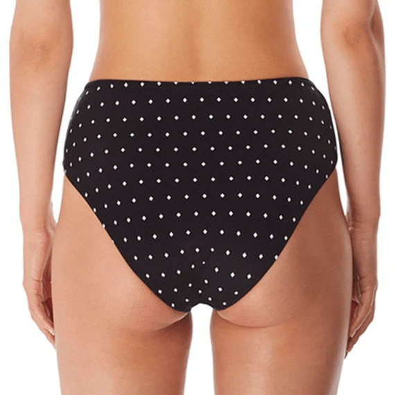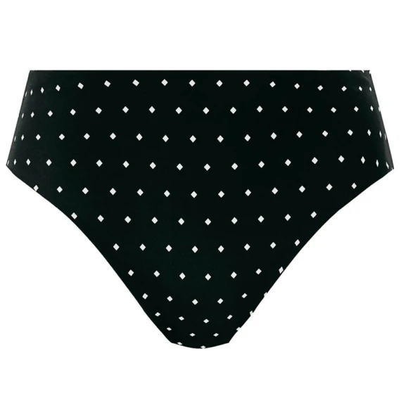 Die Jewel Cove Hohe Bikinihose von Freya Bademode in der Farbe Black. Diese schwarze Bikinihose hat ein Muster mit kleinen Rauten. Das Bündchen ist etwas höher und kaschiert den Bauch subtil.