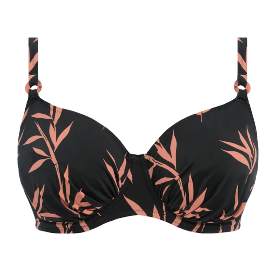 Das Luna Bay Full Cup Bikinitop von Fantasie Bademode ist in der Farbe Lacquered Black ausgeführt. Das Bikinitop hat einen orientalischen Print aus grafischen Bambusblättern. Das Oberteil hat Falten an den Cups und eine gute Passform, die den Busen den nötigen Halt bietet. Das Oberteil bedeckt einen großen Teil der Brust und verleiht ihnen eine natürliche runde Form. Kombinieren Sie den Look mit einem der passenden Bikini Hose aus der Luna Bay Kollektion.