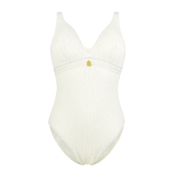 Der Smocky Badeanzug von Annadiva Swim ist in der Farbe Off White erhältlich. Auch in dieser Saison wieder dabei: der fein strukturierte Stoff, der alle Unebenheiten kaschiert. Do we need to say more!? Dies ist der ultimative Favorit von Ihnen und uns. Das plunge Modell schafft ein tiefes Dekolleté und die gepolsterten Cups geben Ihren Busen eine schöne runde Form. Der Badeanzug ist an den Beinen etwas höher geschnitten, so dass er gut sitzt. Kombinieren Sie den Badeanzug mit einem der Annadiva Swim Accessoires. On cloud nine!